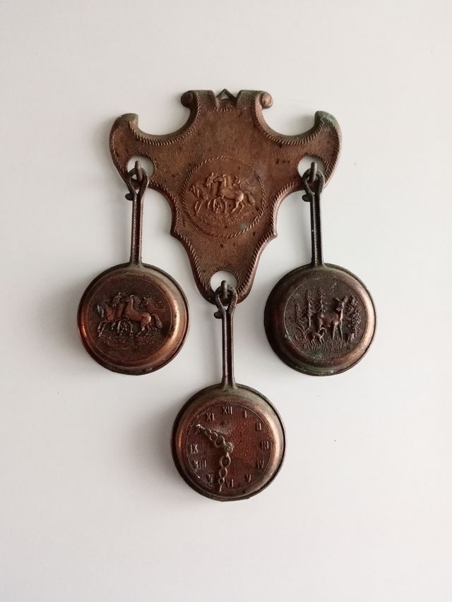 vendo questo ornamento a muro in rame consiste in tre pentoline attaccate alla sua base da attaccare al muro bellissimo
