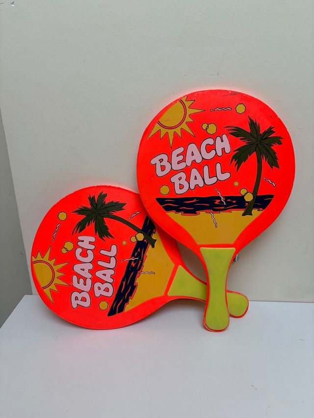 Dettagli del prodottoSet di due racchette da spiaggia con design estivo. CONTIENE DETTAGLI, GUARDA LE FOTO. - Design con palma e sole. - Colori vivaci arancione e giallo. - Include il testo Beach Ball. La descrizione è stata tradotta automaticamente.