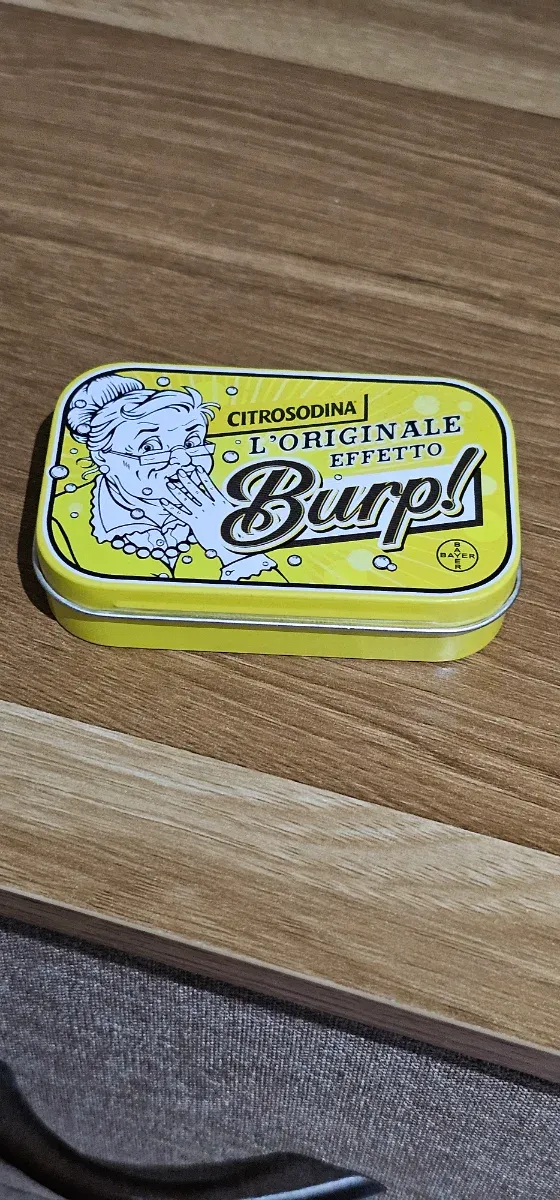 Scatolina in latta vintage Citrosodina con grafica Burp!. - Design retrò con illustrazione. - Colore giallo vivace. - Marchio Bayer visibile.