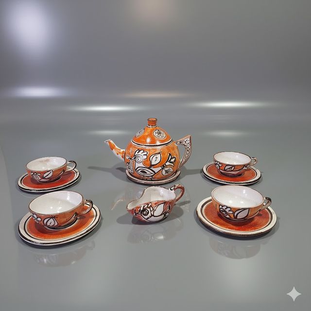 Tutti i pezzi riportano le inconfondibili decorazioni arancio, bianco e nero, con motivi astratti e figure stilizzate, e la firma “De Simone” sotto la base.