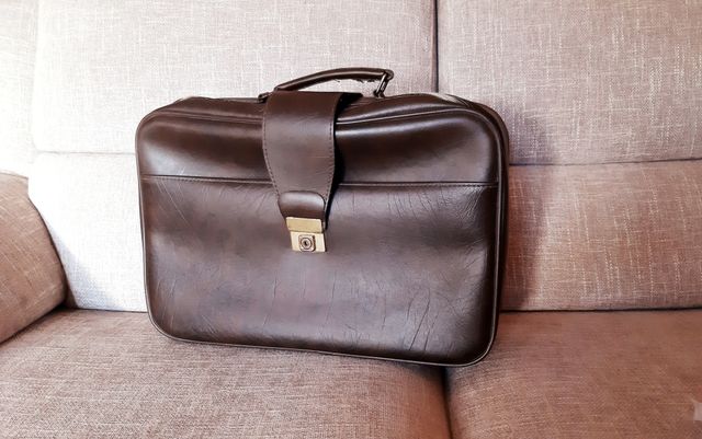 Valigia in vera pelle dei primissimi anni '70, con 2 scompartimenti interni e uno esterno. Cerniere e bottone perfetti. MISURE: 48 x 32 x 14,5