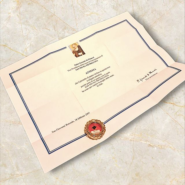 Reliquia di San padre Pio da Pietrelcina Completa di certificato di autenticità. fili serici e sigillo in ceralacca intatti.