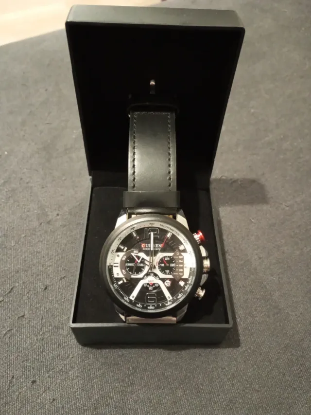 Dettagli del prodottoElegante orologio da polso da uomo con cinturino in pelle nera.