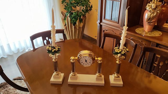 Dettagli del prodottoSet di orologi da tavolo con due candelabri abbinati, in pietra e ottone dorato. Candele e motivo floreale decorativo in regalo Altre figure e altre cose interessanti nel mio profilo. La descrizione è stata tradotta automaticamente.