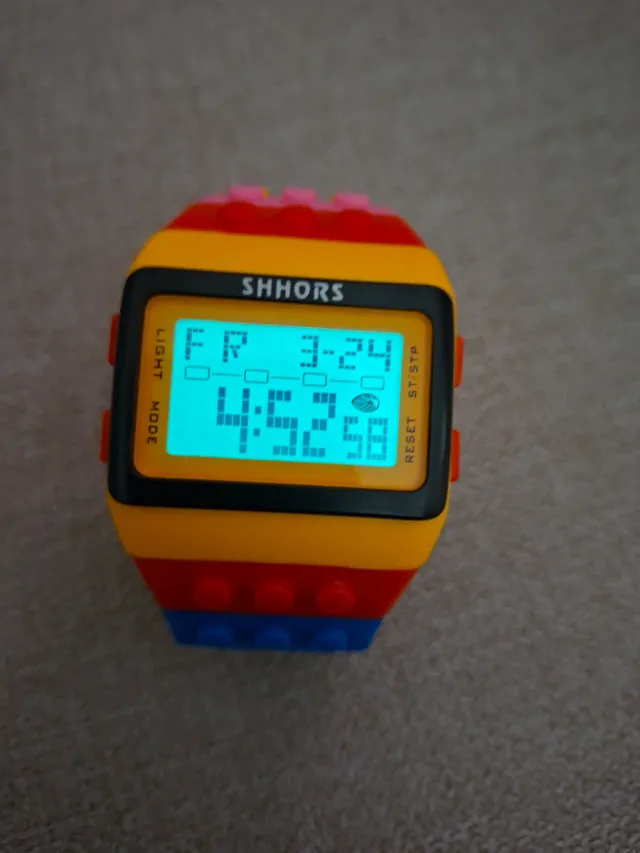 Dettagli del prodottoOrologio digitale con un design divertente ispirato ai mattoncini Lego. La sua cassa e il cinturino combinano colori vivaci. Design ispirato ai mattoncini da costruzione. Cinturino regolabile. Schermo digitale. La descrizione è stata tradotta automaticamente.