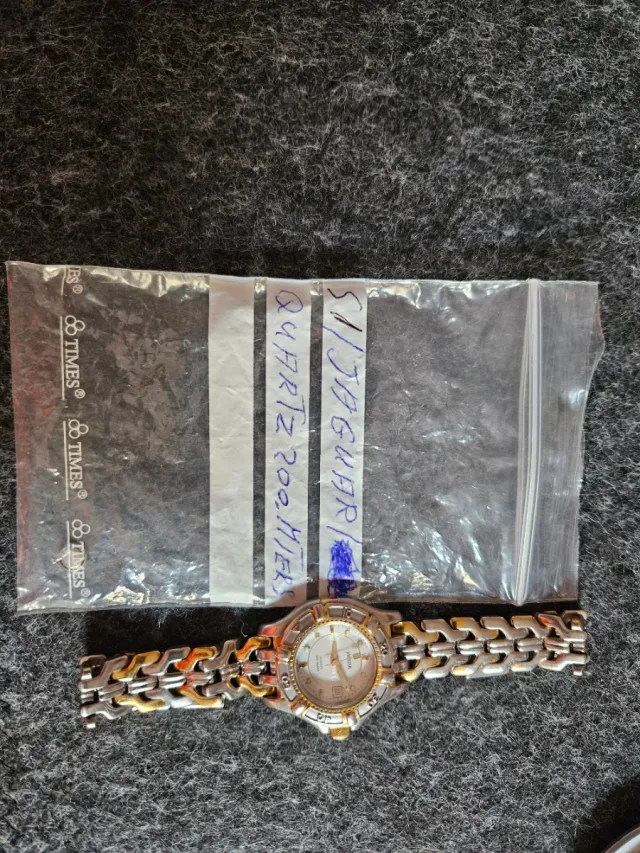 Dettagli del prodottoOrologio da polso del marchio Jaguar con movimento al quarzo. Scatola e cinturino in acciaio inossidabile con dettagli dorati. Lunetta con numeri romani. Resistente all'acqua fino a 200 metri. Nelle foto si vedono tutti i dettagli, funziona perfettamente. La descrizione è stata tradotta automaticamente.