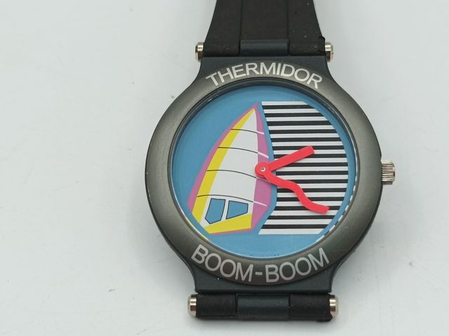 Dettagli del prodottoOrologio Thermidor Boom-Boom degli anni '80 e '90, prodotto in Svizzera, con un design molto suggestivo sul quadrante che rappresenta una candela colorata dallo stile grafico retrò.