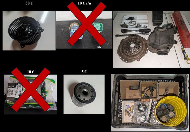 Dettagli del prodottoRicambi per Peugeot 106 sport / Citroen Saxo: - Sensori di temperatura con diversi pin NUOVI: VENDUTO - Guarnizione testata NUOVO: VENDUTO - Motore di ventilazione per riscaldamento NUOVO: 30€ - Filtro olio NUOVO: 5€ - Copricerchi: 5€/confezione - Simbolo Sport metallico: 5€ - Tappi di acqua, bulbo termostato: 2€/unità - Portalampada posteriore: 2€ - Connettori per cavi da collegare: 2€/unità - Spazzole tergicristallo: 5€/confezione - Rondelle e dadi: 1€/unità - Barre di olio: 5€/unità - Coperchio per fusibili e cablaggio motore: 10€ - Coperchio filtro aria: 10€ - Coperchio frizione: 10€ - Triangoli: 5€ - Chiave per ruote: 10€ La descrizione è stata tradotta automaticamente.