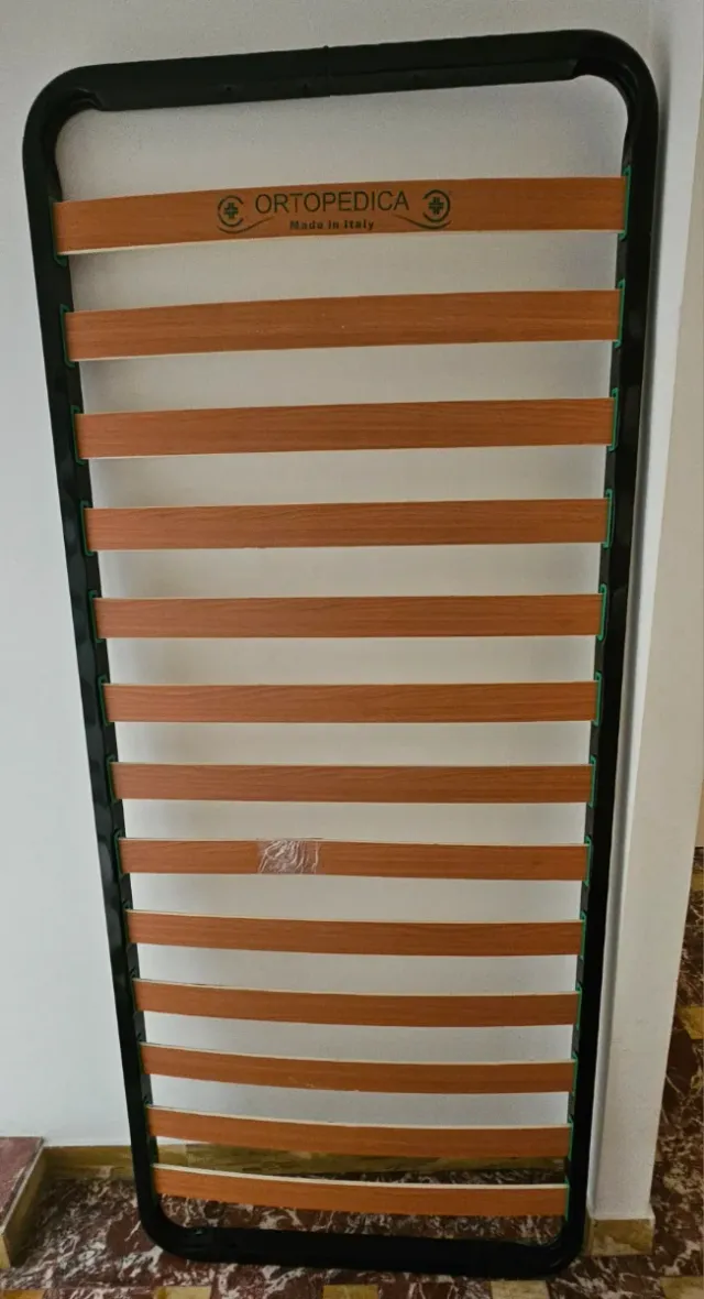 Dettagli del prodottoRete ortopedica per letto singolo, con doghe in legno. Presenta qualche rigatuture e necessita riparazione di una doghe come vedesi sulle foto. Misure 90×180 cm