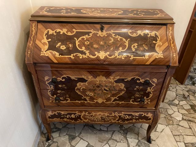 Dettagli del prodottoRibaltina in legno riccamente decorata stile olandese. E’ dotata di due grandi cassetti frontali con una ribaltina che ne consente uso tipo scrittoio. All’interno due cassettini centrali e spazi laterali per carte e penne. Misure: larghezza 90cm, profondità 43cm (chiusa), altezza 105cm. Misure del prodotto