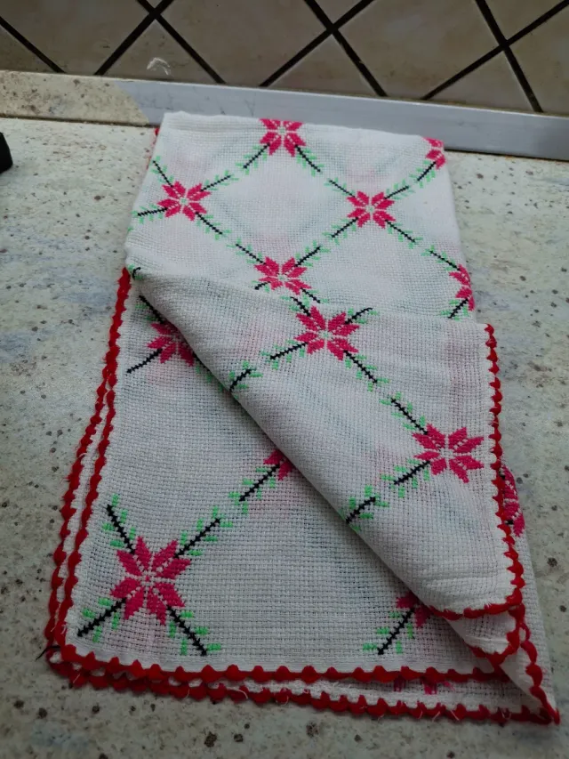 Dettagli del prodottoRunner bianco con un motivo a rombi ricamato punto croce con fiori rosa e dettagli verdi.