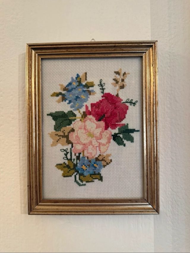 Dettagli del prodottoBellissimo ricamo a punto croce raffigurante un bouquet di fiori colorati, incorniciato in una cornice dorata.