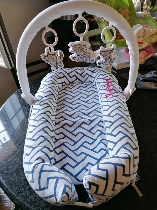 Dettagli del prodottoRiduttore per lettino con arco giochi e due fodere di ricambio. Il riduttore presenta un design a zig-zag blu e bianco, con un arco giochi imbottito bianco.