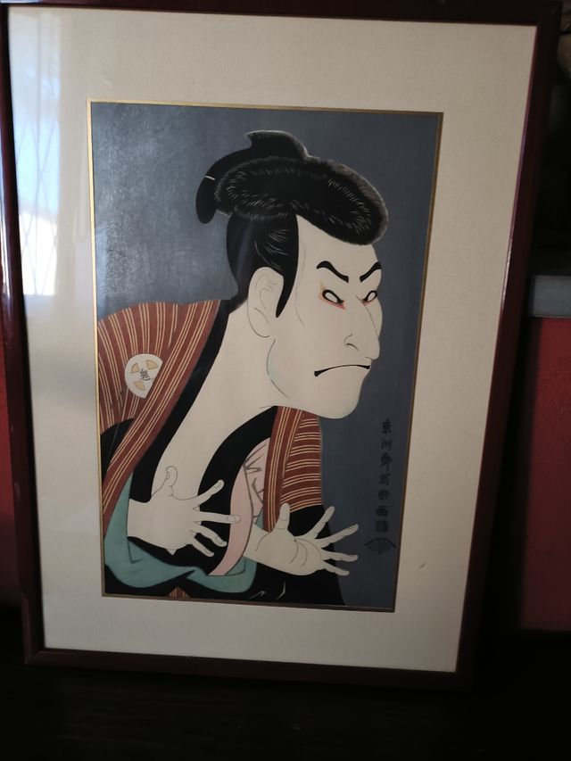 È raffigurato l'attore Kabuki Otani Oniji. Cornice laccata rosso scuro. Metà 900 Misure del prodotto