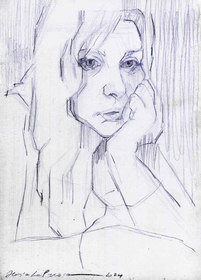 Disegno di ritratto artistico femminile realizzato nel 2024 con matite colorate blu su carta 29,5x21 cm firmato dall'artista Ilaria La Preziosa.