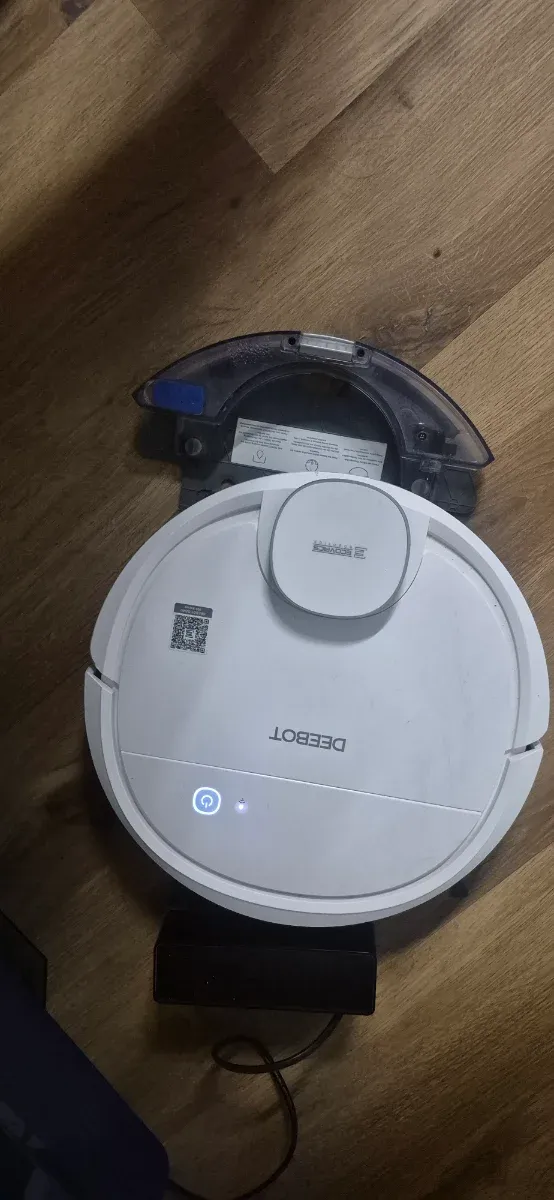 Robot aspirapolvere bianco DEEBOT, ideale per la pulizia dei pavimenti. - Design circolare. - Base di ricarica inclusa. - Indicatore luminoso di stato.