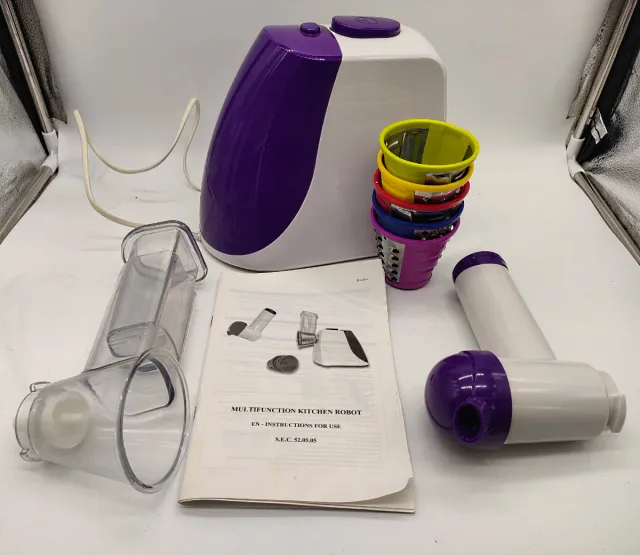 Dettagli del prodottoRobot da cucina multifunzione per tagliare e grattugiare.