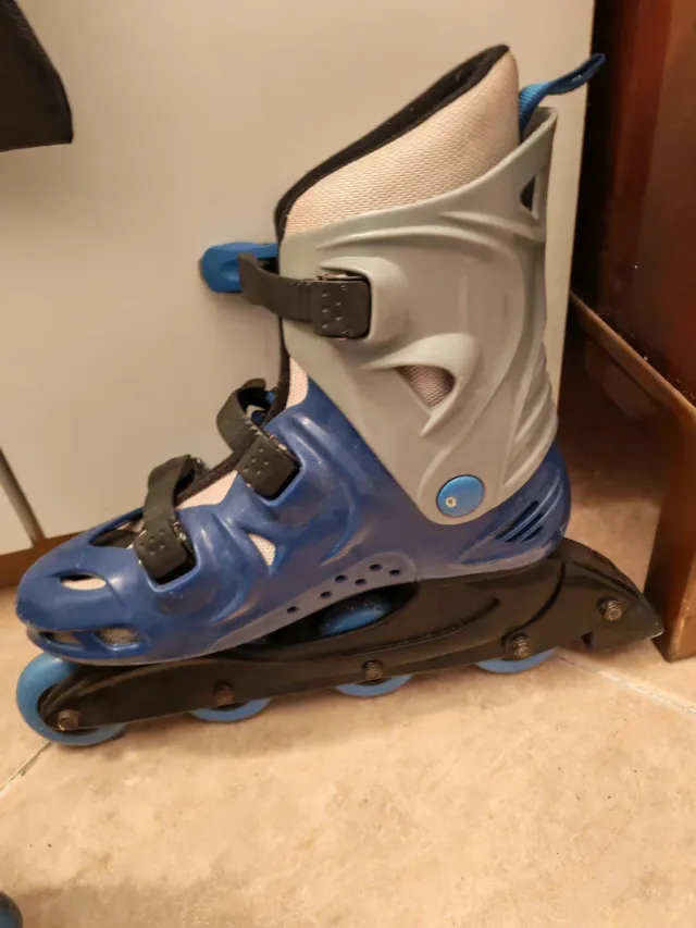 Scarpe da pattinaggio in linea Rollerblade Evolution. - Colore blu e grigio. - Chiusura con velcro e fibbia. - Ruote anteriori e posteriori.