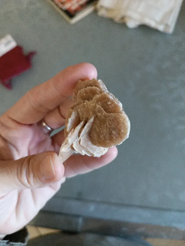 Bellissimo esemplare di rosa del deserto, un minerale affascinante. - Cristalli stratificati di colore sabbia. - Struttura unica e decorativa.