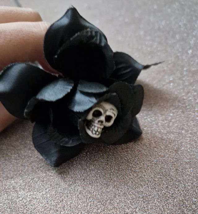 Rosa nera decorativa, perfetta per il periodo di Halloween o per un tocco gotico. - Dettaglio teschio al centro. - Petali in tessuto satinato nero.