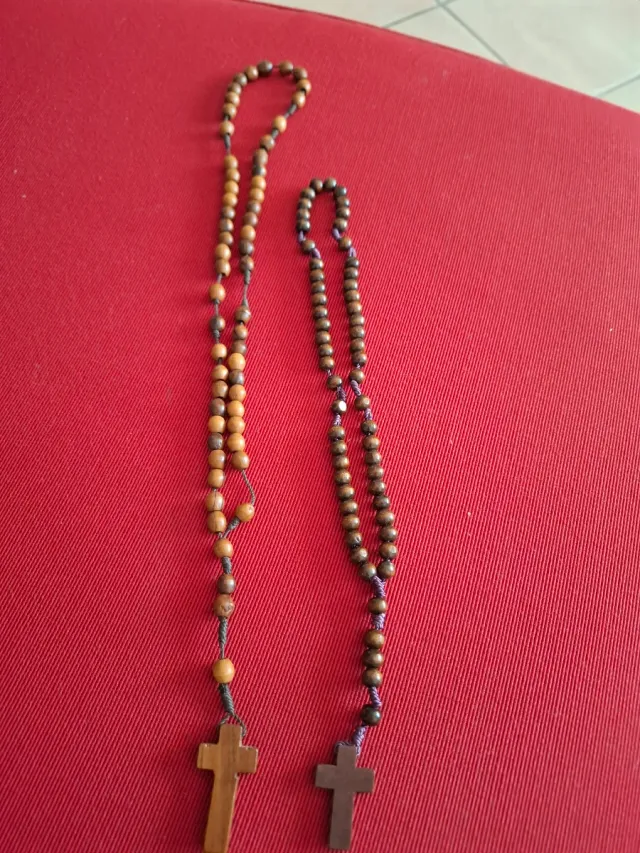 Due rosari in legno con croce. - Rosari con perline in legno. - Croci in legno. - Uno più lungo e uno più corto(nuovo)