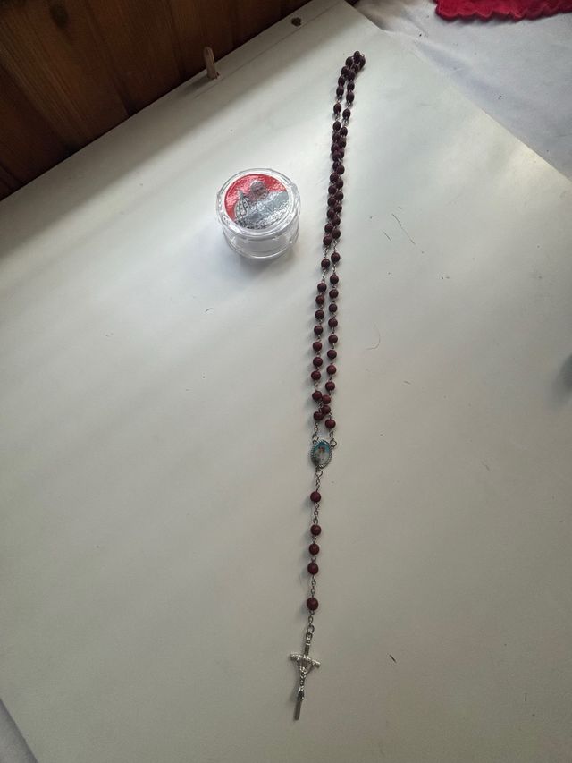 Rosario con medaglia di Papa Francesco. - Perline color risso scuro - Crocifisso in metallo.