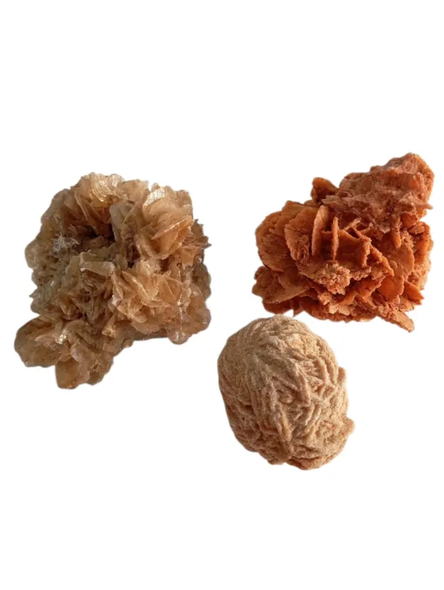 Dettagli del prodottoSet di tre rose del deserto, minerali naturali con formazioni uniche. Minerali di gesso e sabbia. Tonalità terrose e rossastre. Forme cristalline delicate. Misure da 5 cm a 8,9 cm. 3 rose di gesso cristallizzato. La descrizione è stata tradotta automaticamente.