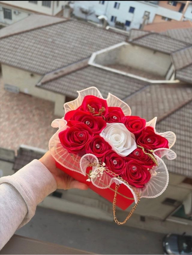 Borsetta decorata con rose rosse e una rosa bianca al centro. La decorazione include dettagli in pizzo bianco e una catenella dorata.