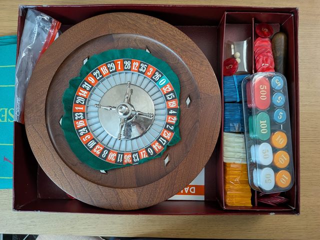 Inclusi ruota in legno con rotore in metallo, tappeto/telo da gioco verde e accessori/fiches come da foto (gettoni, rastrelliera/porta fiches e componenti presenti nella confezione).