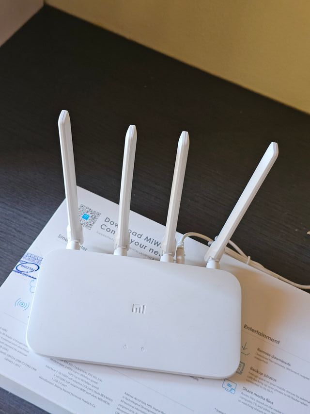 Dettagli del prodottoVendo router Xiaomi MI Router 3, modello EU, dual band (2.4GHz e 5GHz) con velocità fino a 1200 Mbps. Utile per ripetere il segnale in altri luoghi. Ha 4 antenne che si possono direzionare. Si può montare anche in verticale su una parete.