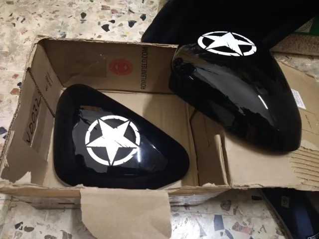 Coppia di pannelli laterali neri lucidi per Royal Enfield Meteor 350. - Design nero lucido. - Decorati con adesivo a stella bianca.
