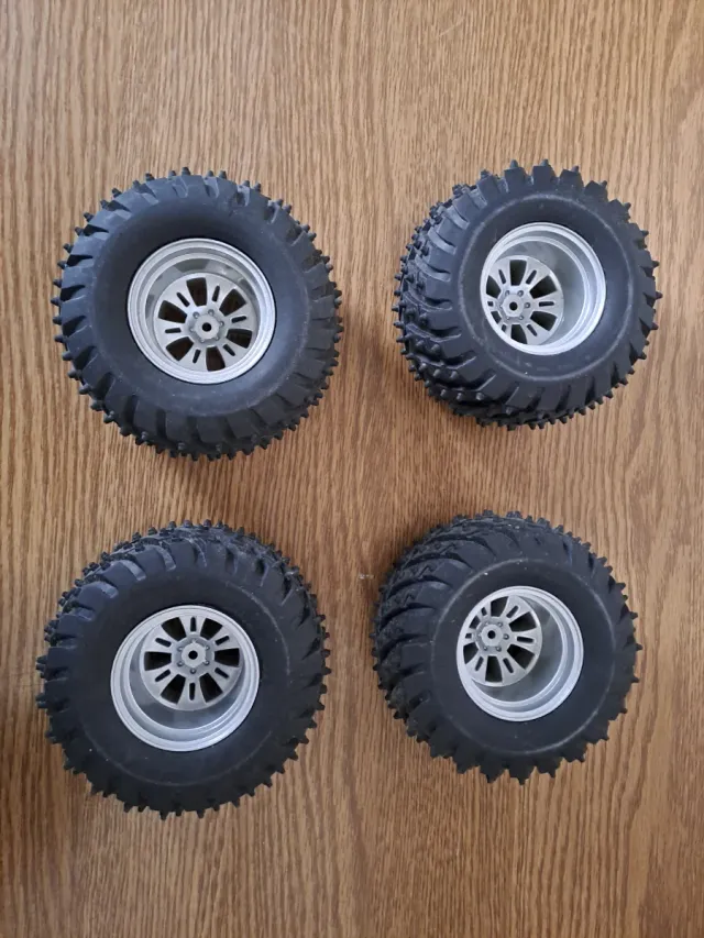 Set di 4 ruote complete per modelli Thunder Tiger SSK V2. - Gomme con tassellatura aggressiva per ottima aderenza. - Cerchi in plastica argentata.