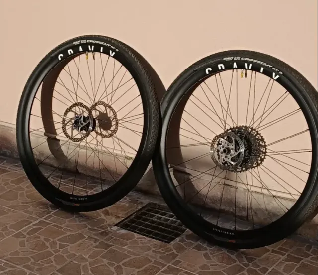 Dettagli del prodottoCoppia di ruote per bicicletta, complete di copertoni e dischi freno.