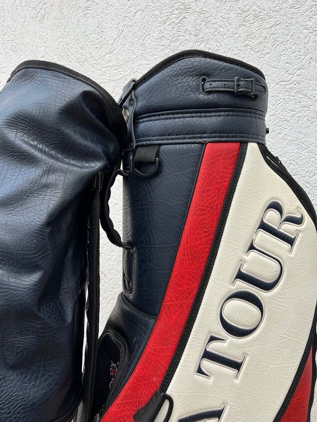 Sacca da golf con design bicolore blu e bianco, con dettagli rossi. - Materiale in pelle. - Logo PGA TOUR in rilievo.