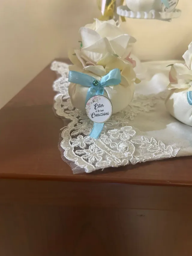 Dettagli del prodottoDeliziosi sacchetti bomboniera decorati con fiori artificiali.