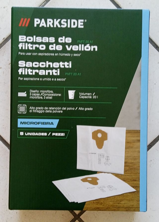 Dettagli del prodottoSacchetti filtranti marca Parkside mod. PVFT20A1, microfibra 3 strati, capacità 20L, diametro bocchetta 40-70mm, altezza bocchetta 10.20cm, confezione da 5 pezzi.