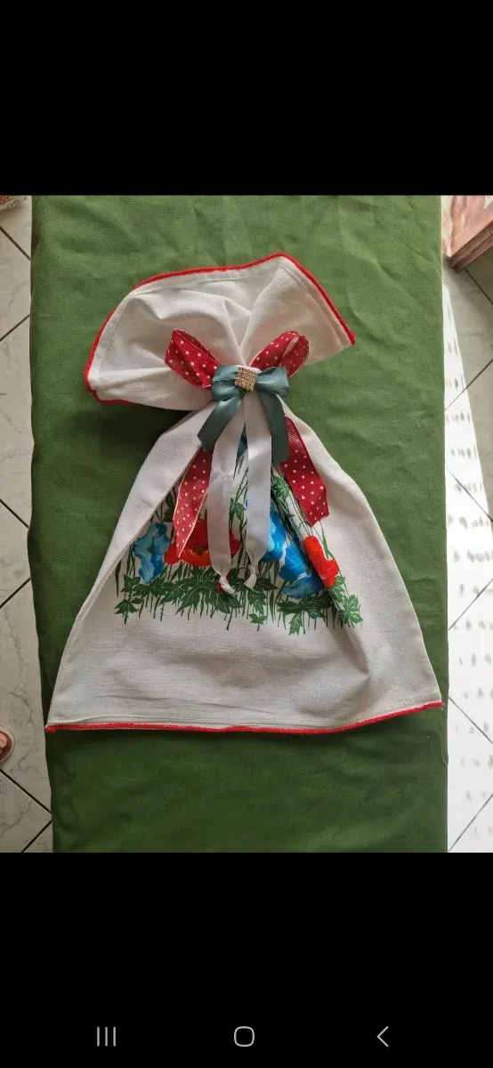 Dettagli del prodottoGrazioso sacchetto decorativo realizzato in puro cotone bianco con bordo rosso e un'allegra stampa floreale di papaveri e fiordalisi. Decorato con nastri rossi a pois, nastro bianco e nastro verde.