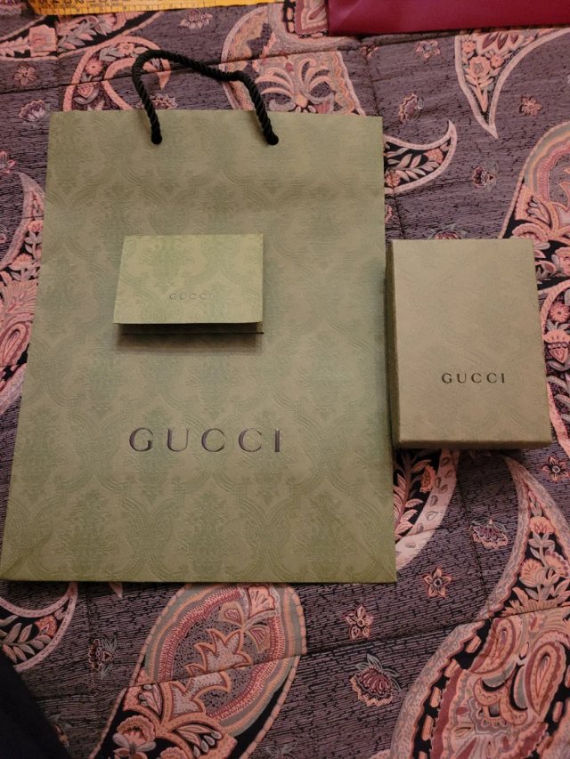 Set composto da sacchetto e scatola originali Gucci. - Sacchetto con manici neri. - Scatola rigida.