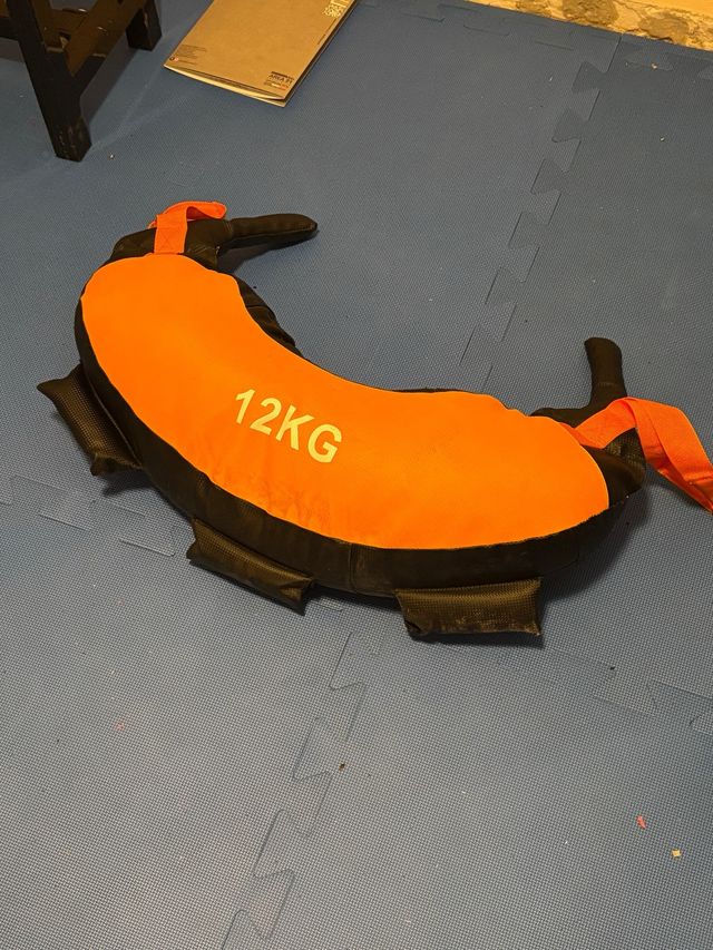 Sacco da allenamento di colore arancione con indicazione del peso. - Peso: 12KG - Colore: Arancione - Materiale: Tessuto resistente