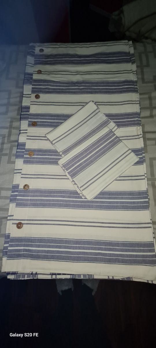 Sacco per piumone matrimoniale completo di federe fantasia rigata panna blu e jeans, Con bottoni ornamentali come da foto.