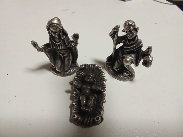 Set di statuine della Sacra Famiglia in metallo. - Include le figure di Maria, Giuseppe e Gesù Bambino. - Dettagli finemente lavorati.