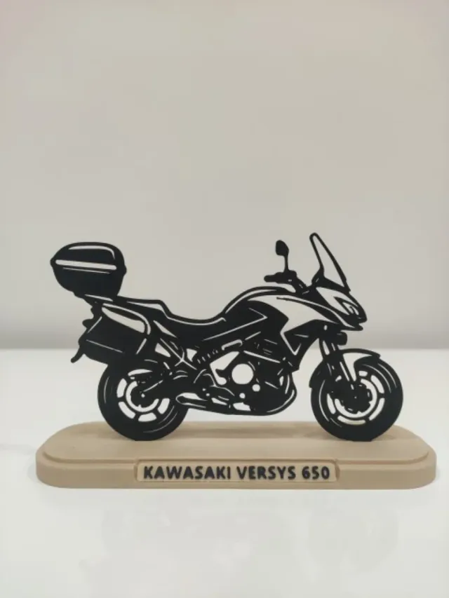 Sagoma Kawasaki Versys 650 (2015-2021) levigata e verniciata nero opaco con base e targhetta effetto legno. Dimensioni approssimative 17cm×10cm