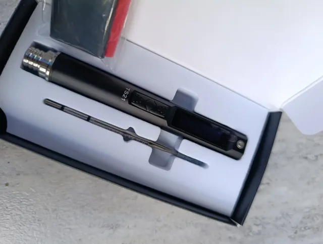 Saldatore portatile con display digitale. - Design compatto e leggero. - Corpo in metallo nero. - Punta di saldatura inclusa.