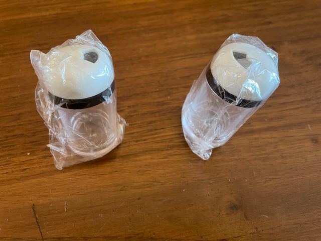 Sale e pepe nuovi In plastica trasparente con tappo bianco e nero Altezza cm. 6 diametro cm. 3