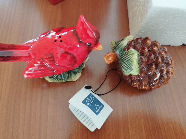 Saliera e pepiera in porcellana Palais Royal a forma di uccellino e pigna. Conservati nella scatola originale, mai usati.