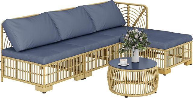 Salón de Ratan per Esterni da 5 Pezzi, Set da Giardino con Divano Modulare, Cuscini e Tavolo da Caffè con Vetro, Grigio