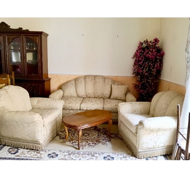 Dettagli del prodottoBellissimo salotto completo in stile classico, composto da un divano letto a tre posti e due poltrone. I mobili sono rifiniti con dettagli eleganti e presentano un tessuto damascato beige chiaro con frange. Include anche un tavolino da salotto in legno. Perfetto per arredare con gusto la tua casa! - Divano a 3 posti