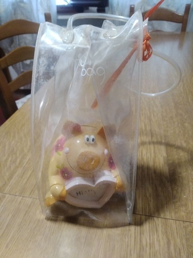 Dettagli del prodottoclassico porcellino in porcellana, salvadanaio, portafoto. Il cuoricino ha la calamita e si può togliere per mettere una foto. Buone condizioni, mai usato. Lo tenevo in una borsetta in plastica, un po' rotta, ma ho provato ad aggiustare.