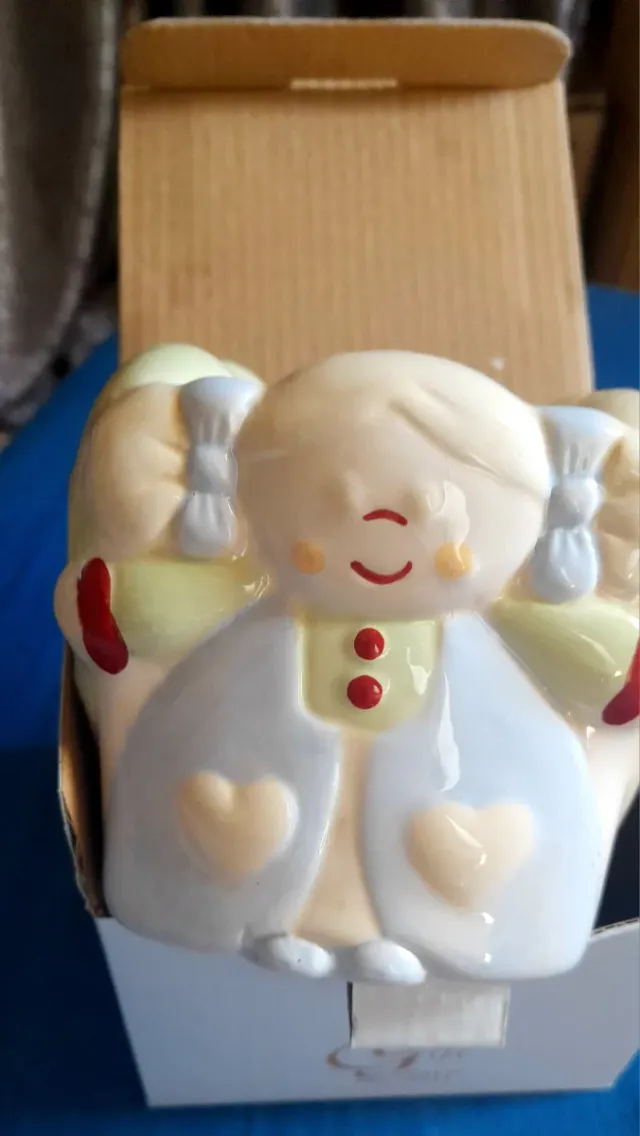 Salvadanaio a forma di bambina con dettagli a cuore. - Design colorato e allegro. - Finitura lucida in ceramica. - Ideale come decorazione o regalo.