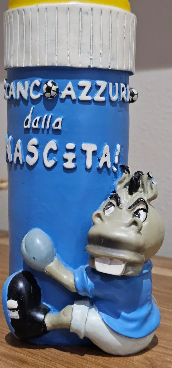 Dettagli del prodottoSalvadanaio a forma di biberon, dedicato ai tifosi dell'SSC Napoli.